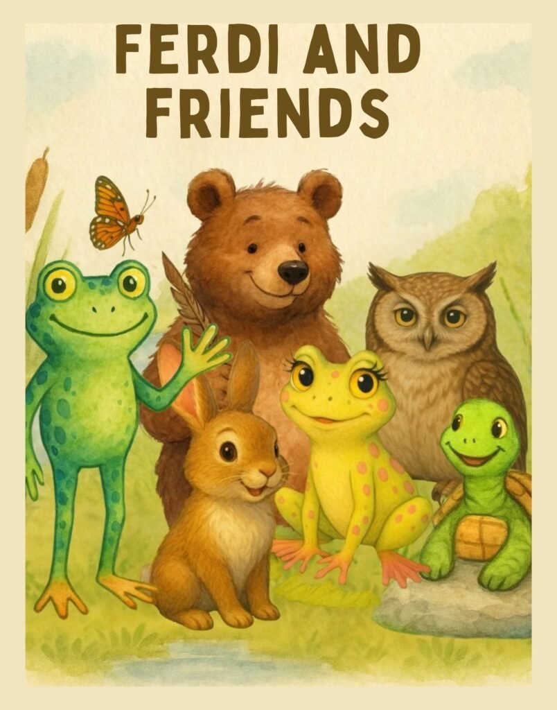 Bring the magic of Ferdi’s Pond to your wall! This colorful poster features Ferdi the frog and all his friends—Fiona, Bramble, Bartholomew, Freddy, Thistle, and Silas. A cheerful piece of art to brighten bedrooms, playrooms, or classrooms while sparking imagination and friendship.